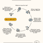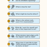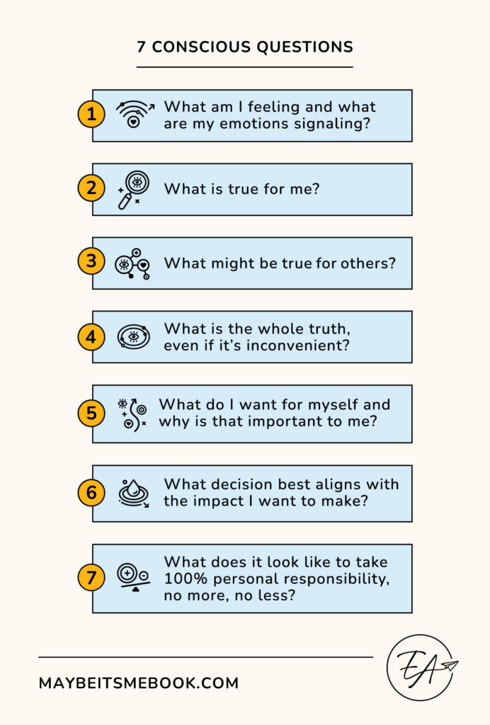 This illustration captures the seven questions that interrupt reactivity and restore choice. It guides you to slow down, surface what’s true, consider impact, and choose intentionally — without bypassing emotion or responsibility.